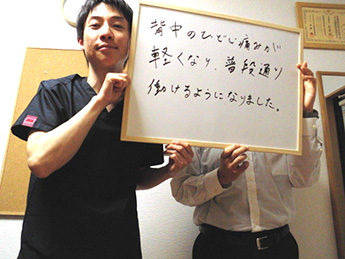 背中の痛みがひどく、仕事に支障が出ていたのが、痛みが軽くなり、普段通り働けるようになりました。