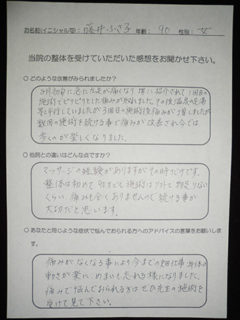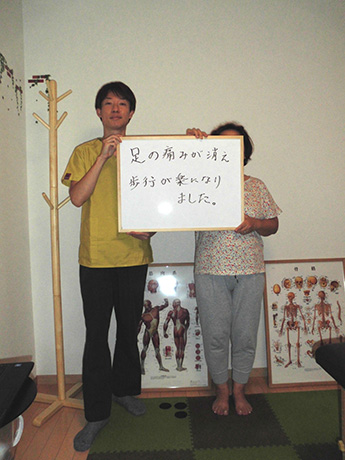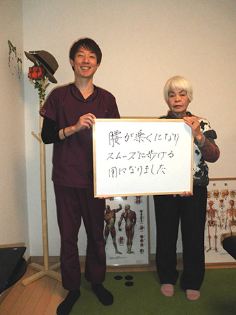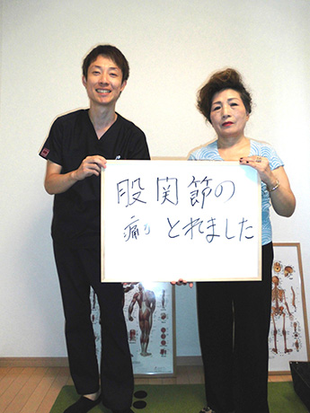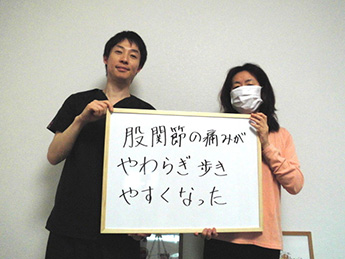 股関節の手術後ということもあり不安でしたが丁寧に施術について説明して下さり、実際2回目の施術後、痛みを感じる事なく歩行できていることにびっくりしました。