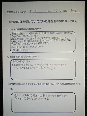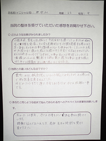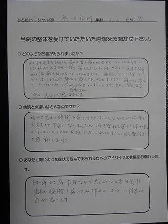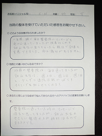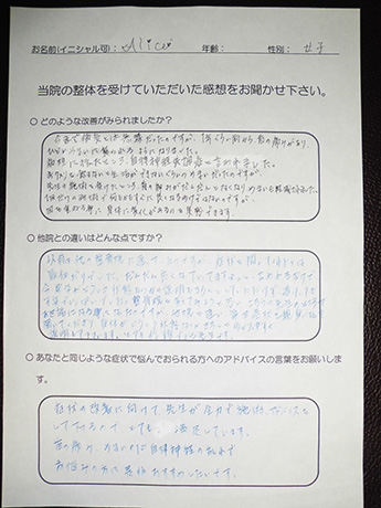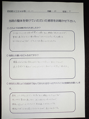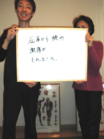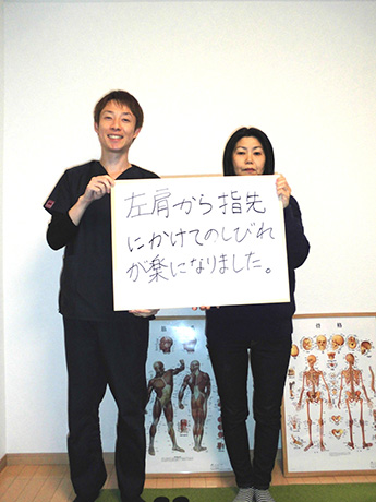 左肩から指先まで、1日に何度も訪れる痺れ。座ることも時折辛くなり、とうとう痺れのため、熟睡することさえ難しくなり病院を訪れましたが、原因がわからず「ストレス」の一言で片づけられ途方に暮れて、毎日を過ごしていたとき、目に飛び込んできた広告にワラをもすがる思いで、ここに来ました。