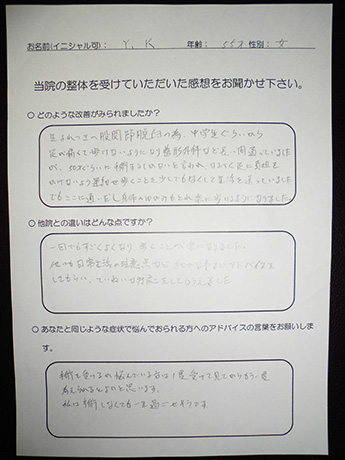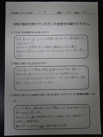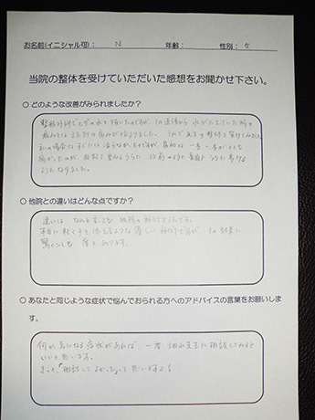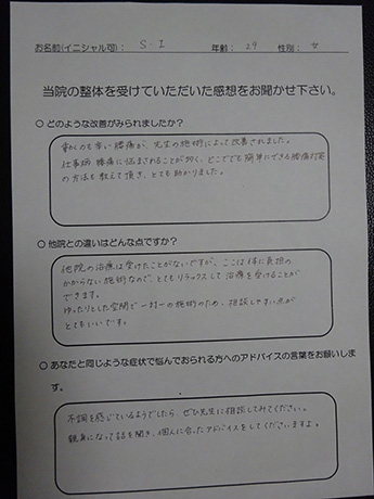 整体施術は初めてで、またマンションの一室ということもあり少し不安でしたが、施術自体はこんなのでほんとに改善するのかと半信半疑なくらい痛みのなく、楽な施術でした。