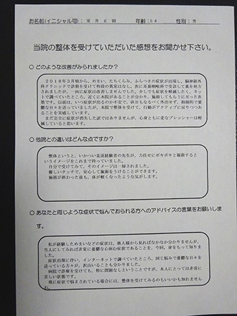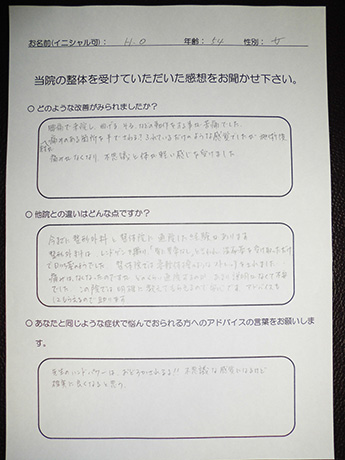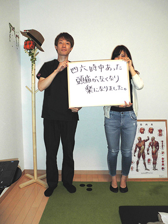 以前は、いつ症状が出るのか不安で、休日もなるべく外出せず、抑制的で憂鬱な日々を送っていましたが、こちらで整体を受けて、行動がアクティブに戻りつつあることを実感しています。
