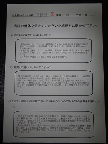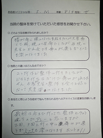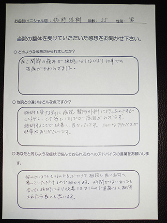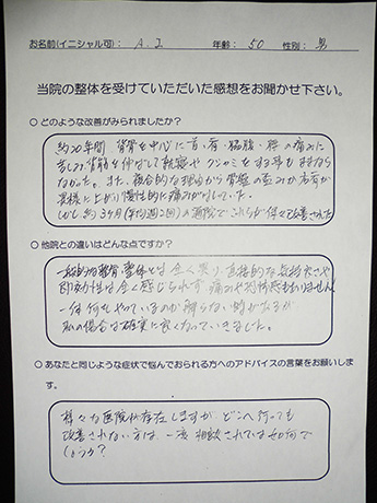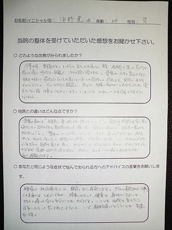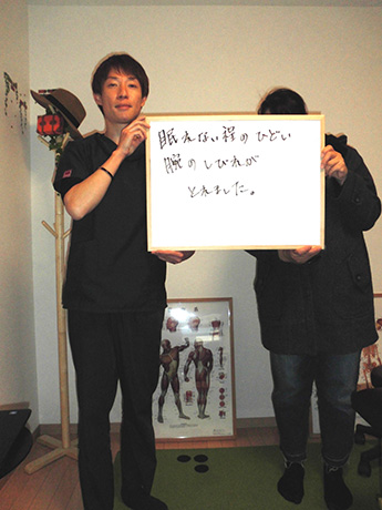今回の施術では改善策を信じて継続することで、体の調子がよくなっているのを実感できたことです。