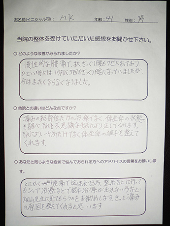 頻発していたぎっくり腰が起きなくなった! M・K様 39歳 男性