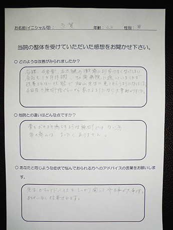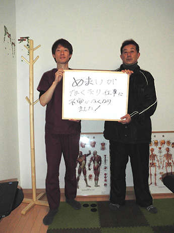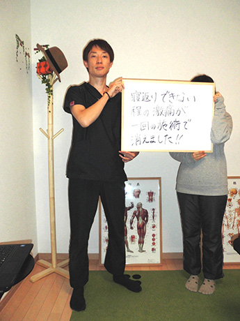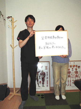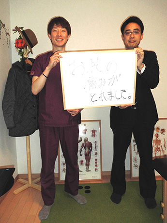 苦しみから一刻も早く別れたいとの思いからネットで当院を訪ね施術を受けました。