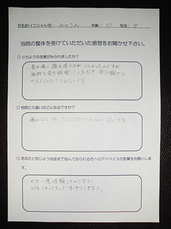 肩の痛みが改善し、楽に腕が上がるようになった! みいさん(仮名) 57歳 女性