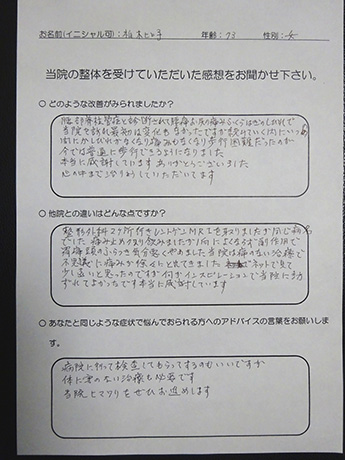 歩行が困難だった程の腰から足への痛みとシビレが消失! 柏木ヒロ子様 73歳 女性