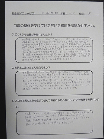 「めまい」だけでなく「膝痛」「腰のダルさ」も改善! 大津繁雄様 82歳 男性
