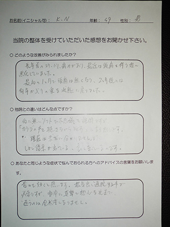 何度か回数を重ねるうちに、シビレの範囲も狭まり、今ではシビレを気にすることがほとんどなくなるまでになりました。