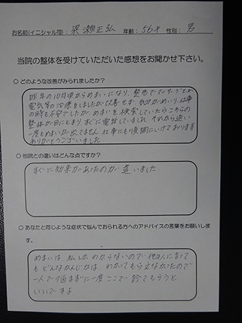 2回目の施術(4日目)終り帰路についた時、歩速が早くなった事が気づき又、腰への負担も楽になっており施術より10日後にはほとんど「めまい」は発生していません。